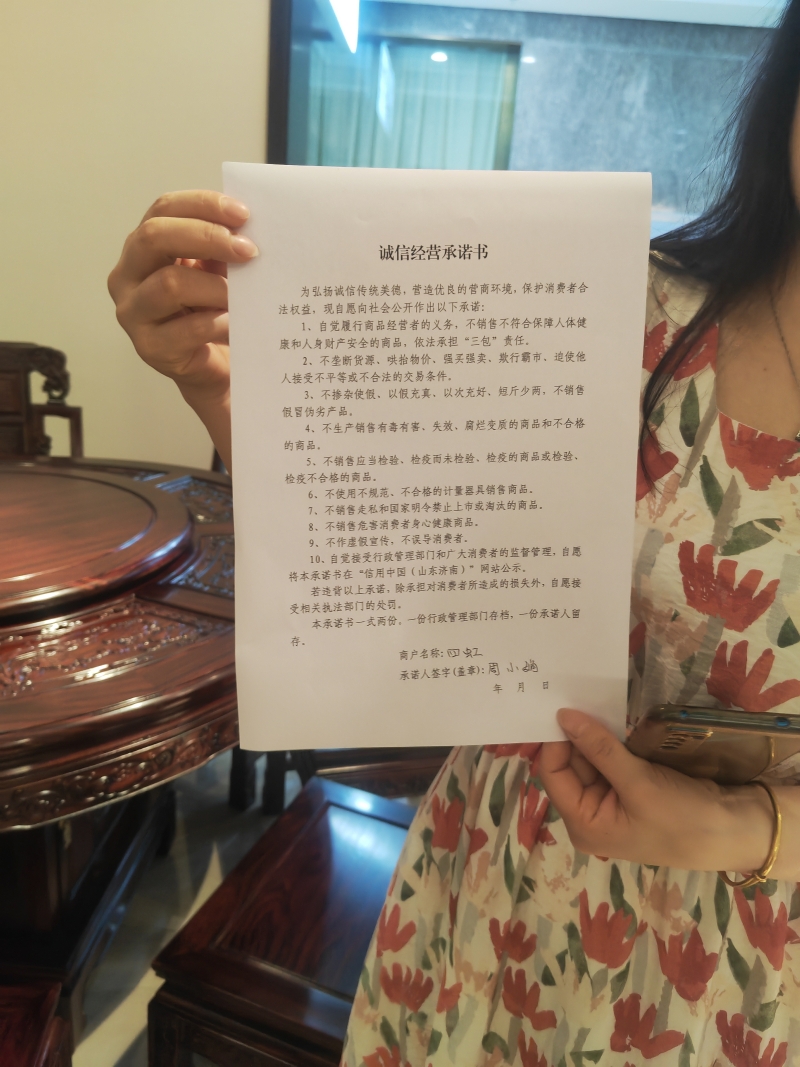 随后,工作人员走入吉斯家具、鲁班家具、百川家具等商户发放“以诚为根,以信为本”的信用知识宣传手册,并倡导商户签署诚信经营承诺书。