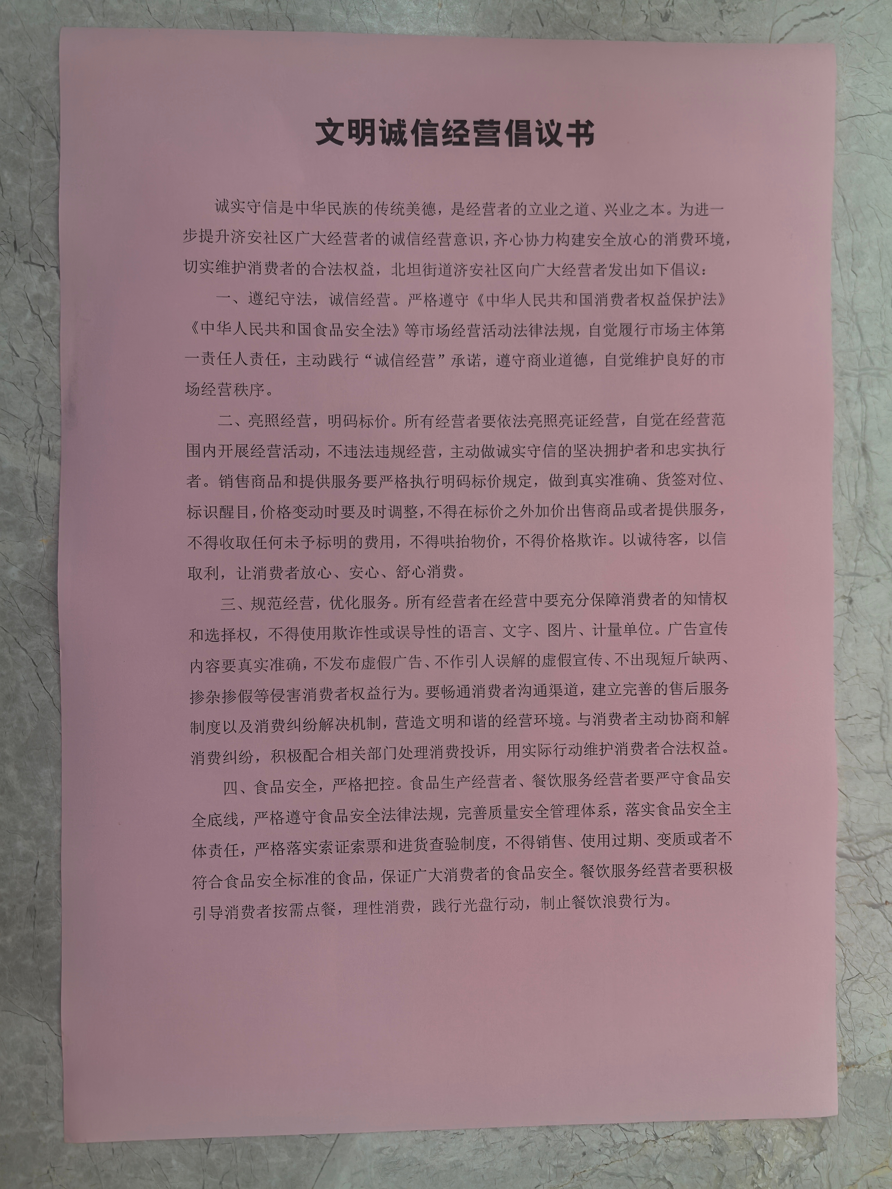 每到一处,大家都与商户亲切交流,并递上《文明诚信经营倡议书》。“您看,倡议书里提到不销售过期商品、明码标价,这些不仅能赢得顾客信任,也是咱们商户长远经营的根本。”社区工作人员在向餐饮店老板讲解时说道。不少商户接过倡议书后当场表示,会严格遵守经营规范,用诚信服务留住顾客。济安社区还在辖区余乐园广场设置了宣传点,共向居民发放倡议书20余份。
