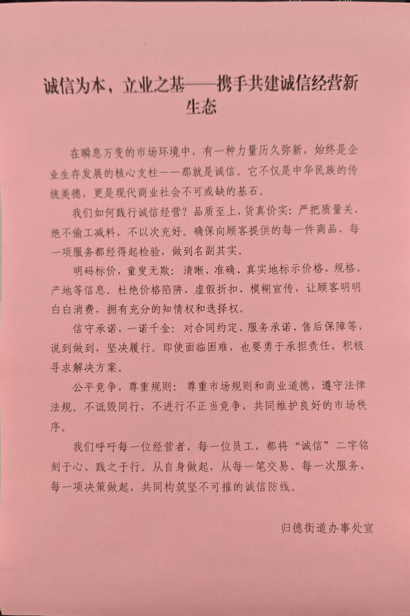 此次诚信文化宣传活动共发放宣传单页30余份,涉及群众50余人,有效提升了辖区商户的诚信守法意识,营造了良好的诚信经营氛围。下一步,长清区归德街道将继续探索创新宣传方式,建立健全长效监管机制,将诚信建设融入日常管理服务中,推动商户诚信经营常态化、制度化,为街道经济社会高质量发展注入更强的“诚信”动能。