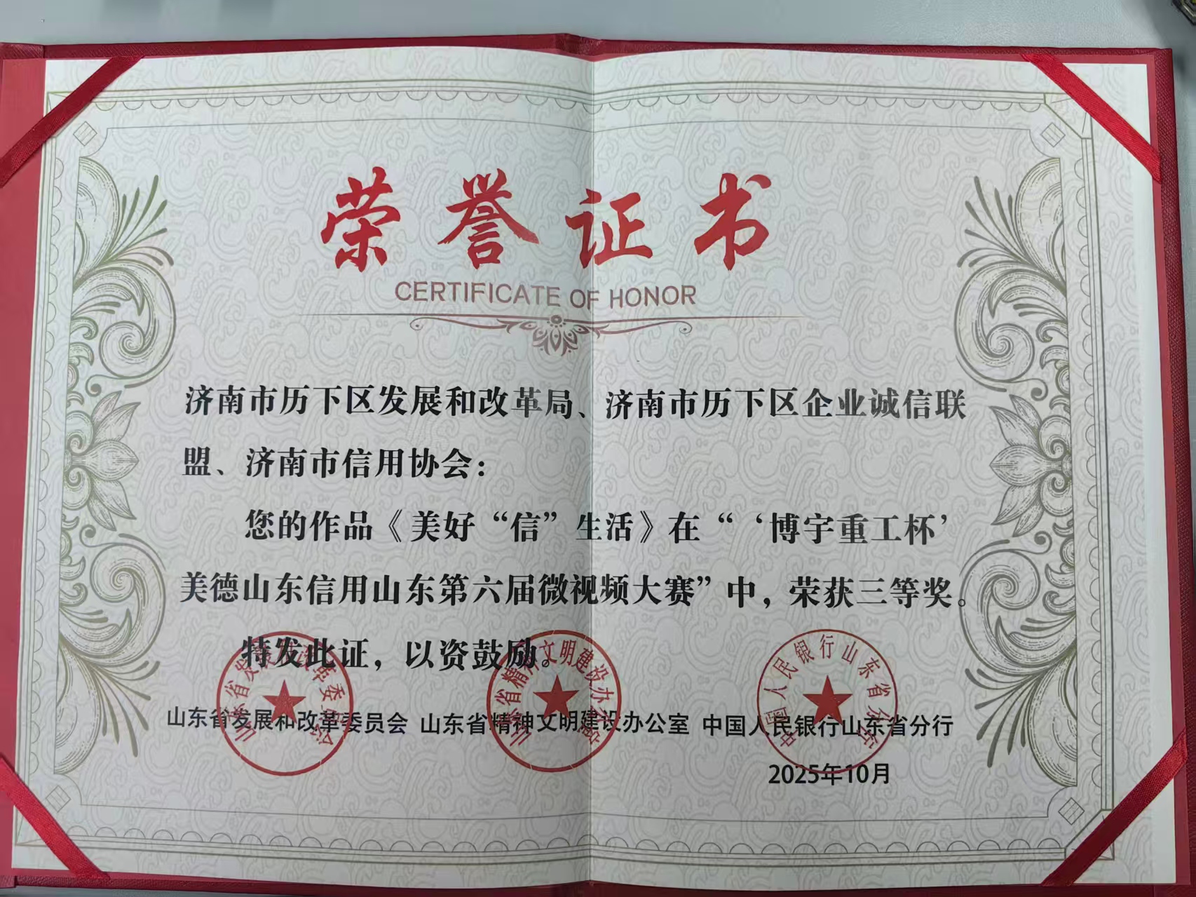 10月15日,由山东省发展改革委、省文明办等单位指导,省社会信用中心、省信用协会主办的“博宇重工杯”美德山东信用山东第六届微视频大赛获奖名单正式公布,由济南市历下区发展和改革局、历下区企业诚信联盟及济南市信用协会联合报送的诚信宣传微视频《美好“信”生活》成功斩获三等奖,以生动影像展现了历下区信用建设的民生温度与实践成效。