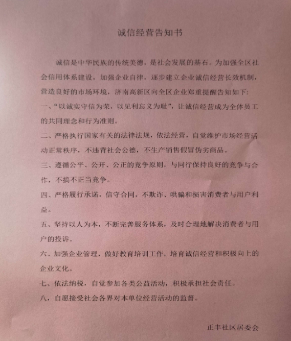 正丰社区工作人员联合社区志愿者深入“亚朵酒店”“漱玉平民大药房”“万资便利”等沿街商铺,逐户发放《诚信经营告知书》30余份,围绕“不售假、不欺客、不推责”三大原则展开宣导:要求商户严控商品质量,杜绝过期及三无产品;明码标价,严禁虚假宣传与价格欺诈;对售后问题主动担责,建立24小时响应机制。